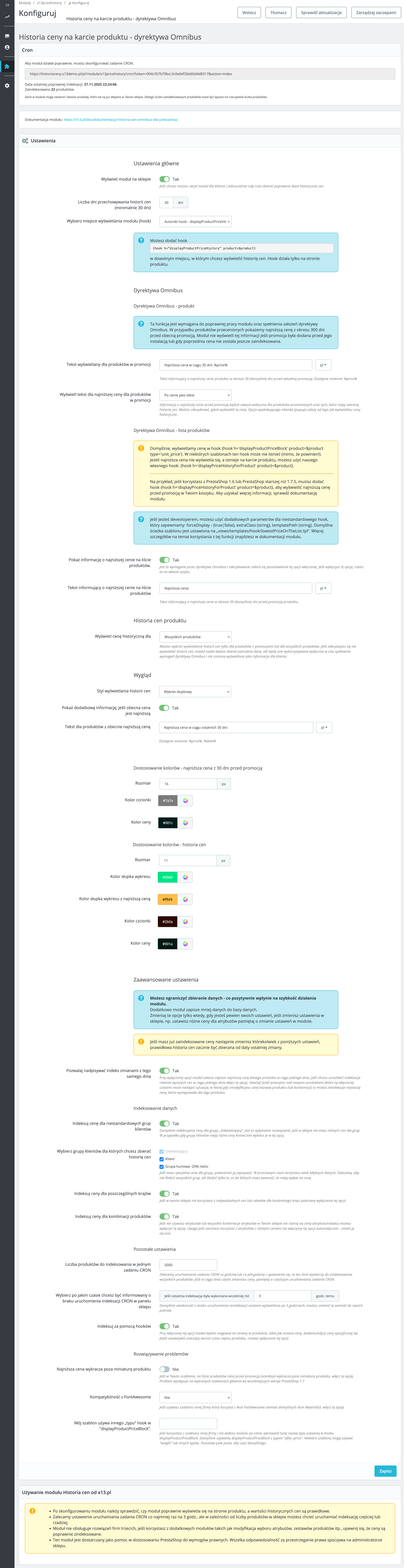 W prosty sposób, bezpośrednio z panelu administracyjnego, dostosujesz moduł do swoich wymagań niezależnie od tego, czy chcesz wyświetlić tylko najniższą cenę z 30 dni przed aktualną promocją, czy również historię cen z wybranego zakresu.