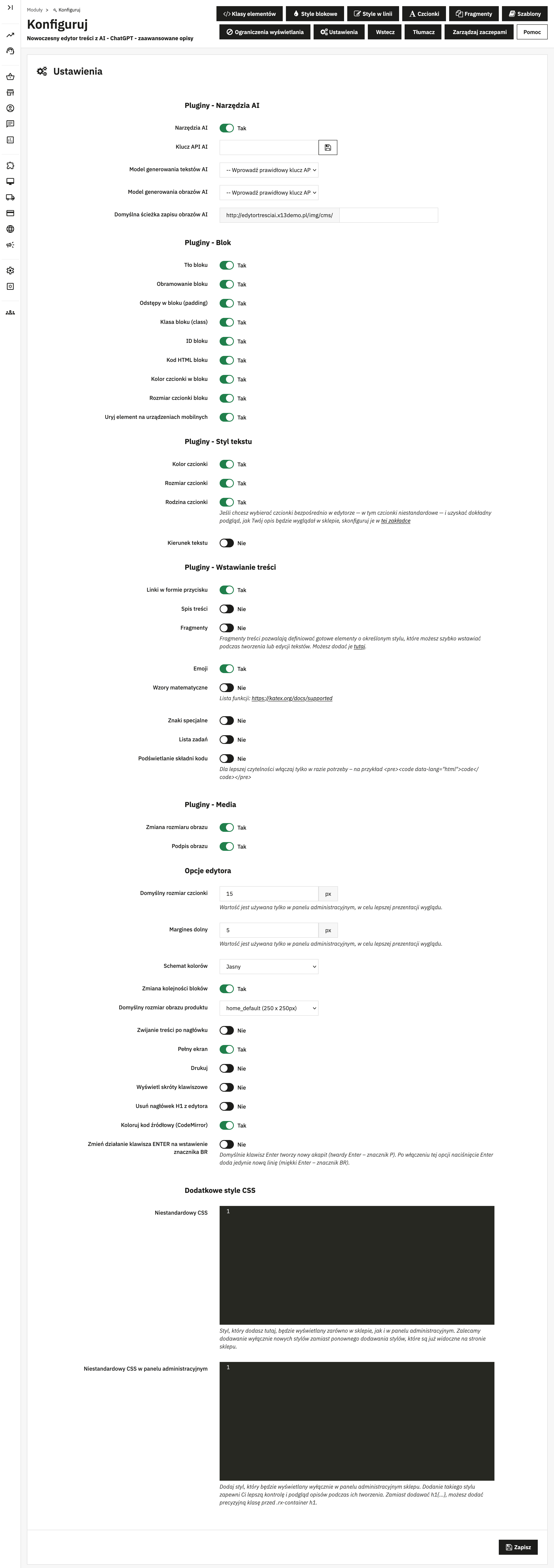 Skonfigurujesz wszystko od klas elementów i czcionek po własne style inline i blokowe. Możesz tworzyć fragmenty tekstu, szablony i ukrywać plugin na wybranych podstronach. Pełna kontrola nad edytorem w Twoich rękach.